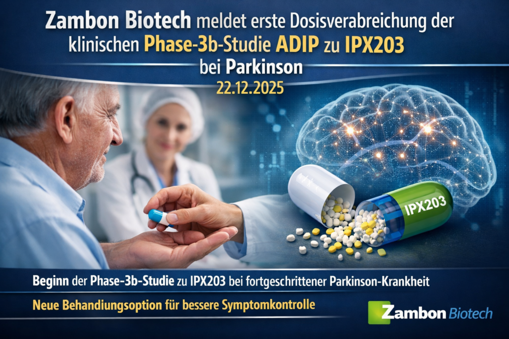 Zambon Biotech – ein spezialisiertes Biotechnologie-Unternehmen der Zambon-Unternehmensgruppe, das den Aufbau eines wissenschaftlich fundierten und wirtschaftlich tragfähigen Portfolios innovativer und patientenorientierter Arzneimittel anstrebt – gab heute bekannt, dass der erste Teilnehmer mit fortgeschrittener Parkinson-Krankheit in die europäische Phase-3b-Studie ADIP (IPX203 bei fortgeschrittener Parkinson-Krankheit) eingeschlossen wurde. Diese Phase-3-Studie -soll die Wirksamkeit und Sicherheit von IPX203 in einem neuen Behandlungsschema im Vergleich zu Levodopa/Carbidopa (LD/CD) mit sofortiger Freisetzung (IR = sofort freisetzend) untersuchen.